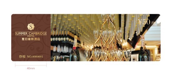 酒店代金券的設(shè)計(jì):正面簡約勾畫出酒店的主題,以特色作為背景圖,還可附上一小段酒店的簡介,讓客戶一目了然酒店的整個(gè)結(jié)構(gòu),背面是印刷券的使用說明。將在這張酒店代金券上起到打動(dòng)消費(fèi)群的作用,吸引其注意,促使消費(fèi)者到酒店消費(fèi)。